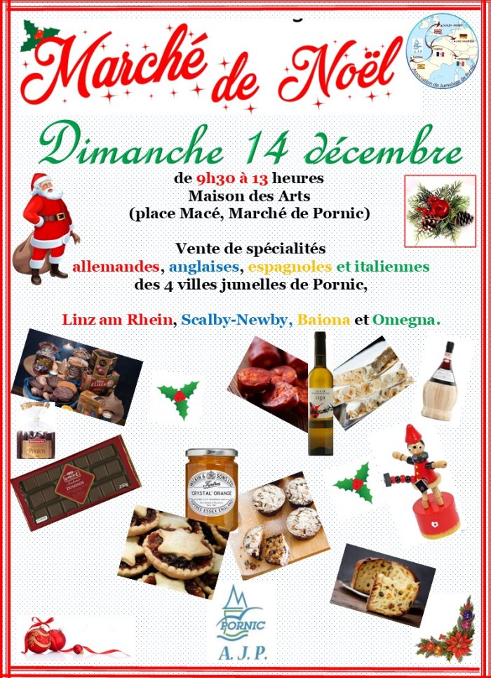 Ne manquez pas notre traditionnel marché de Noël, vous y retrouverez l’ambiance chaleureuse des fêtes et pourrez découvrir la gastronomie et les savoir-faire artisanaux de nos villes jumelles : Linz am Rhein, Scalby&Newby, Baiona et Omegna.