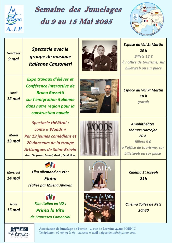 L'association de jumelage de la ville de Pornic (A. J. P.) contribue par la découverte de nos villes jumelles à tisser des liens amicaux avec leurs habitants. L'AJP propose des ateliers de langue en anglais, allemand, espagnol et italien. L'AJP aide les associations pornicaises pour tous projets en relation avec l'Angleterre, L'Allemagne, l'Espagne et l'Italie.