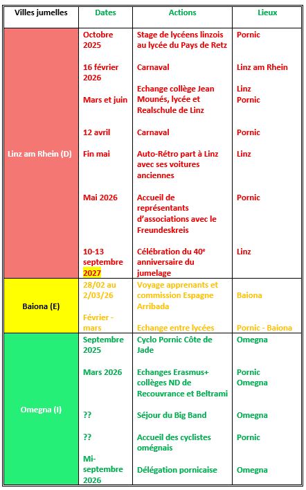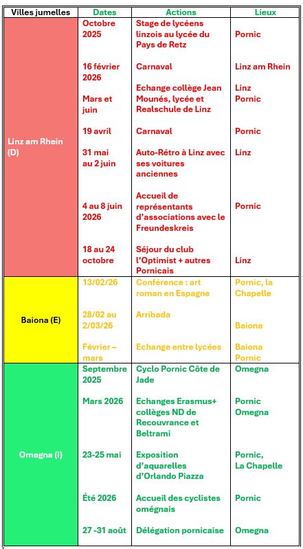 L'association de jumelage de la ville de Pornic (A. J. P.) contribue par la découverte de nos villes jumelles à tisser des liens amicaux avec leurs habitants. L'AJP propose des ateliers de langue en anglais, allemand, espagnol et italien. L'AJP aide les associations pornicaises pour tous projets en relation avec l'Angleterre, L'Allemagne, l'Espagne et l'Italie.